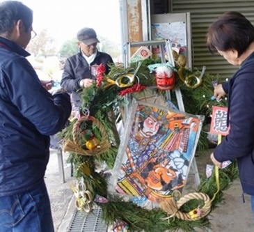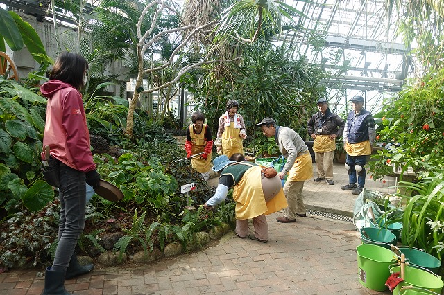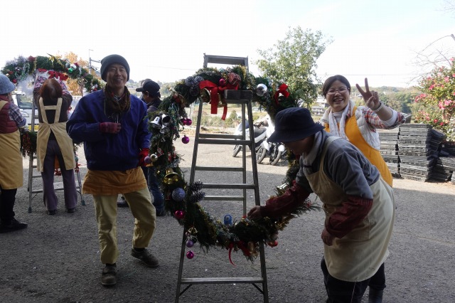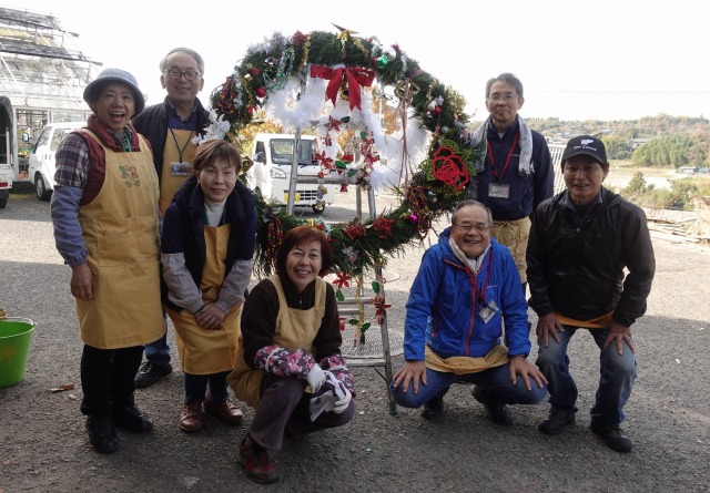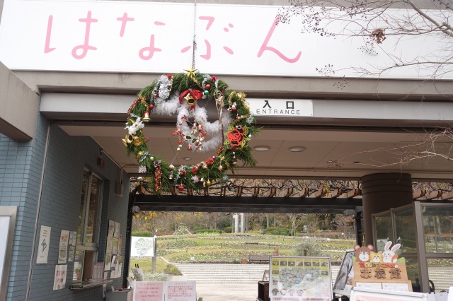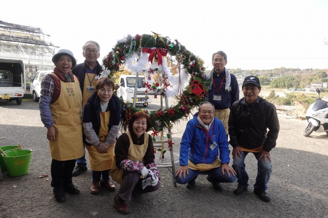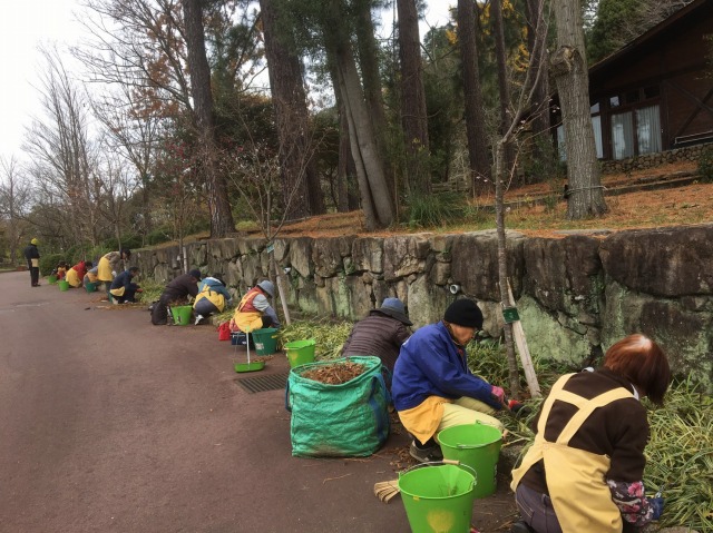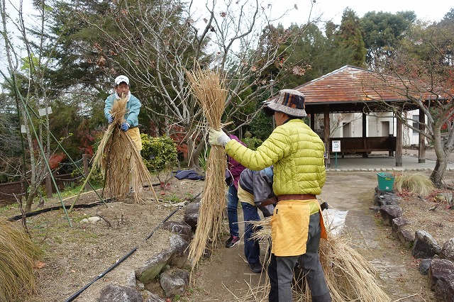 花の文化園入り口(駐車場からの階段のアーチ、エントランス、事務棟、温室入り口)に、お正月を迎える準備のボランティアが無事終了しました。