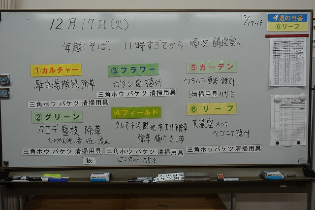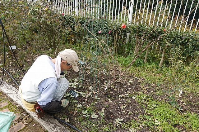 ガーデングループはつるバラの剪定・誘引作業です。2018年9月4日の台風の被害でなくなっていた木根館との間の柵が新調されていました。またこの柵につるバラが絡まって美しく咲く日が見られそう・・
