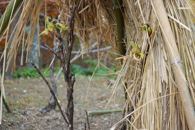 グリーングループが、寒牡丹の蕾に覆いをかけていました。
