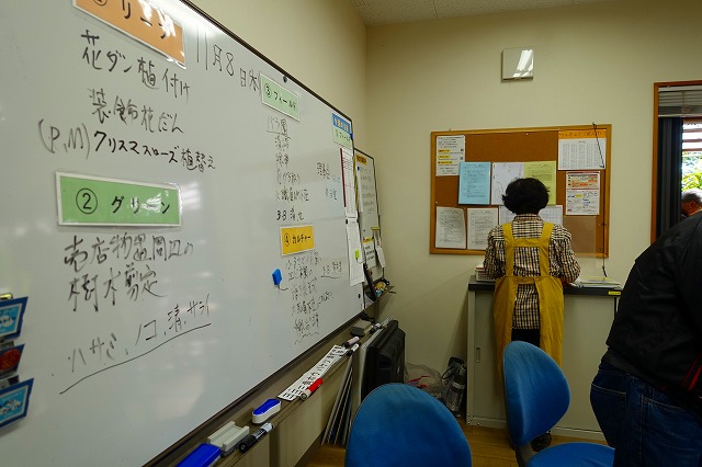 ただいま学校ガーデニングシーズンたけなわです。参加者のボードを確認中の学校ガーデニングプロジェクトメンバーさんの後ろ姿です。