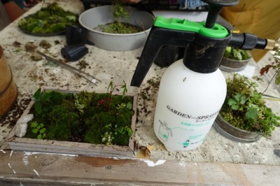 左のスプレーはユニークで、蓄圧式ガーデンスプレーというんだって。その使い方にびっくり。箱庭には毎日朝晩スプレーが必要とのこと、なるほどこれだと楽ちんそう。右は家型ピックもおまけで作成。