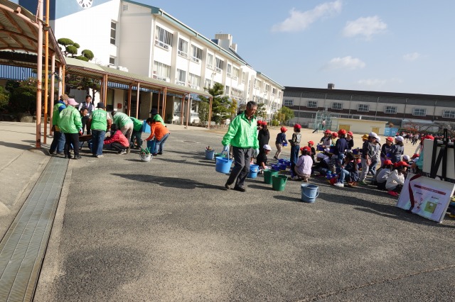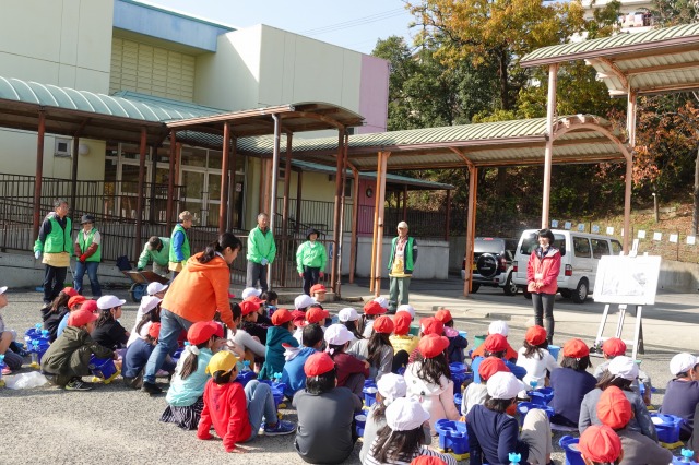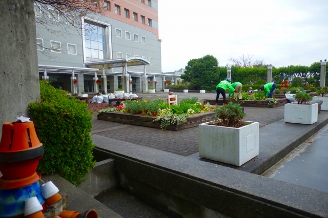 今日は楠小学校で、1年生62名と花の文化園職員さん2名、フルルガーデン倶楽部ボランティア6名、そして先生方で、チューリップ型→朝顔型プランターにボランティアが種から育てたビオラと、学校で用意されたチューリップの球根の植え付けです。