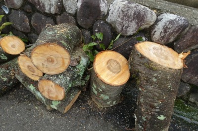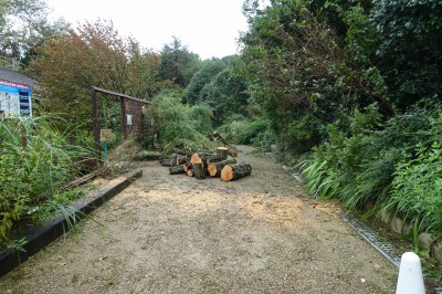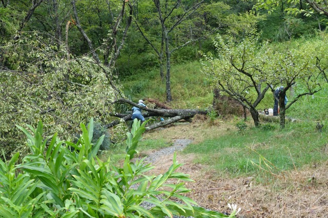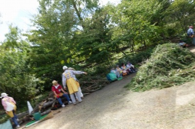 参加者は、切られた幹や枝を下の通路まで運んだり、掃除です。
