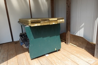 多目的集会室の通路の修繕用木材も積まれたまま。