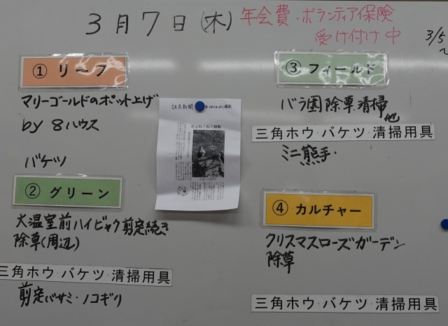 本日は全体活動日で、午前中、一般グループの次年度グループリーダーを決める会議が、グループ別に行われました。各グループ概ね1時間以内に決められて、順次、日常作業に入り、装飾花壇のメンテナンスを行いました。午後は特別グループのリーダーを決める会議がありました。