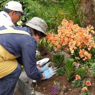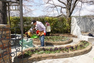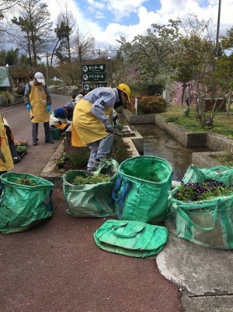 リーフグループとフラワーグループ共同作業で、ビオラと葉牡丹を抜き、その後にベゴニアやイソトマなどの苗を植えました。 あっという間に、綺麗に植え替えが終わりました。 (byY.Harano)