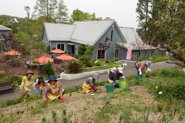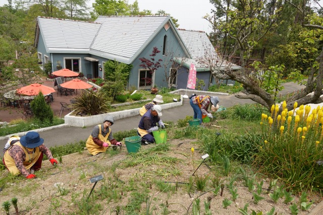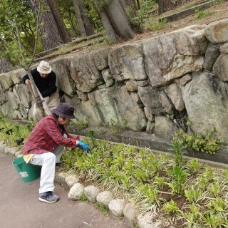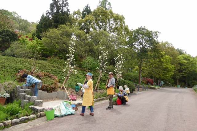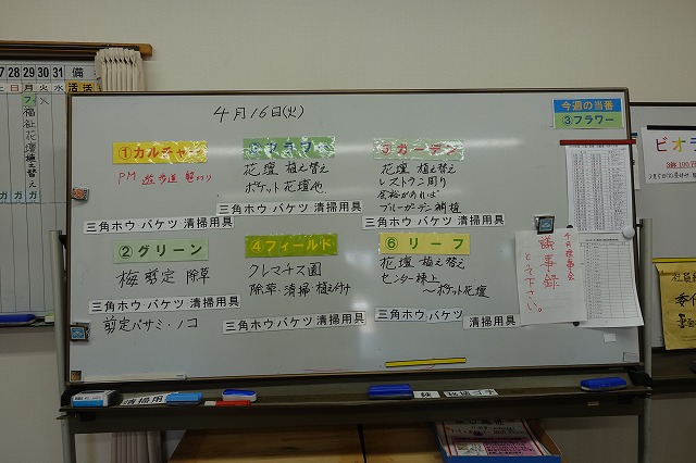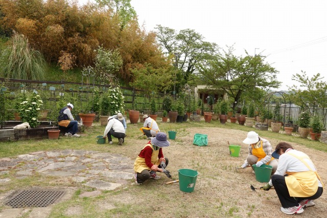 4月23日(火) の活動風景です。フラワーグループは、フラワードレスの装飾花壇の周辺の回廊にユリに植え付けです。堀り上げを考えて、深く掘ってポットのままで植え付けとのこと。本日は200ケ。まだたくさんバックヤードで出番を待っています。