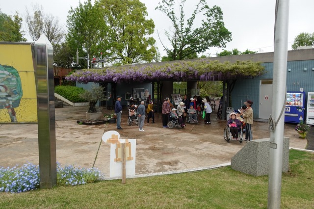 4月25日(木)10時 エントランスの藤棚の下でお出迎え中