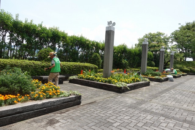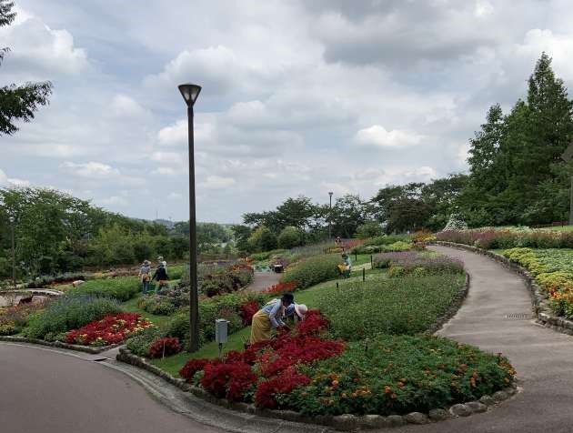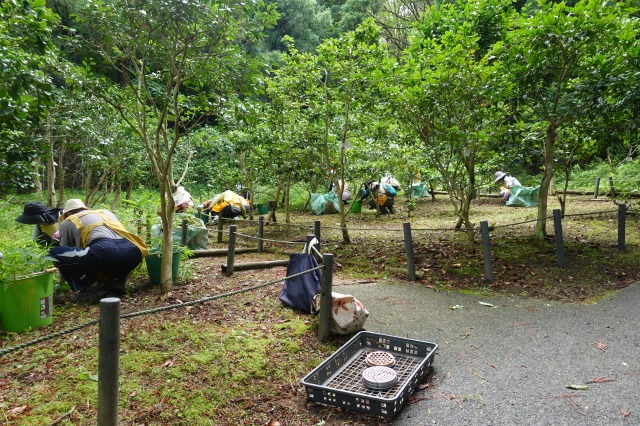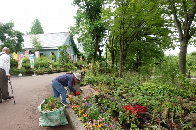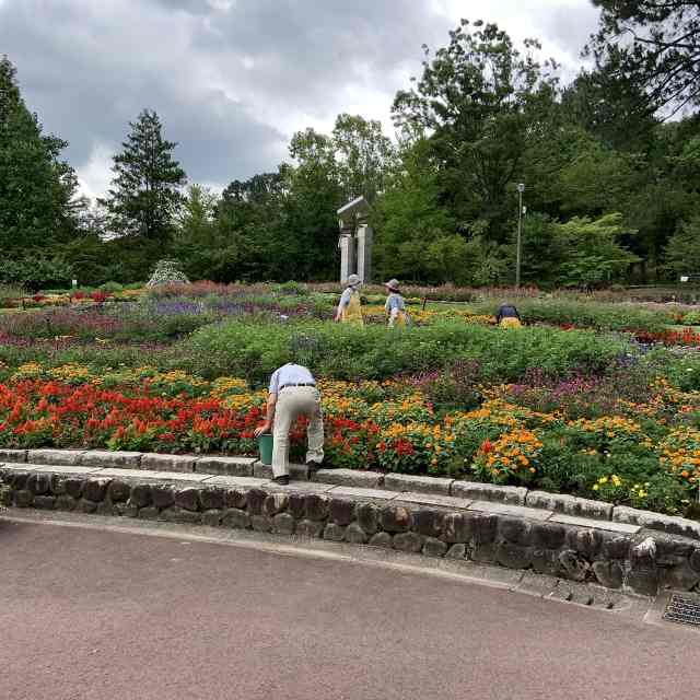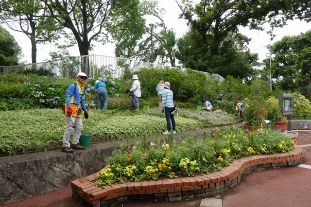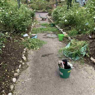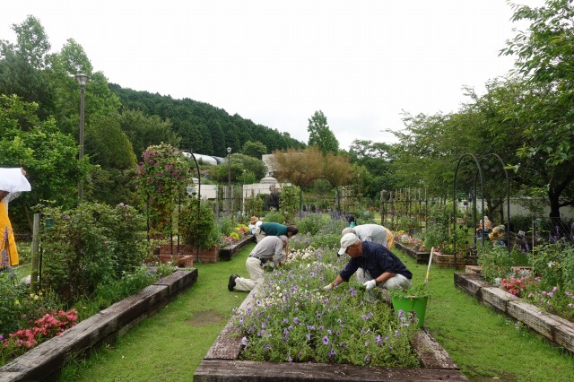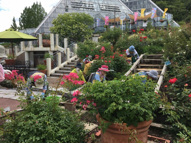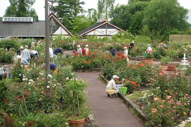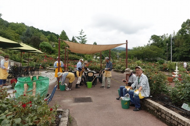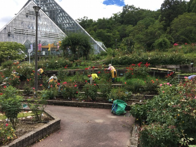 バラ園の除草と枯れた花がら摘みの全体作業。