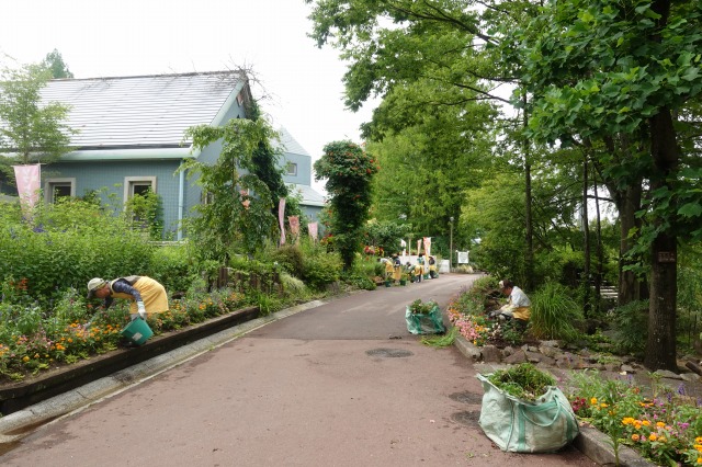上はバラ園に続くクレマチス園でのフィールドグループの花壇植え付け、下はフラワーグループの装飾花壇メンテナンス風景。