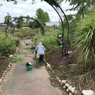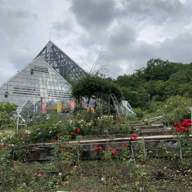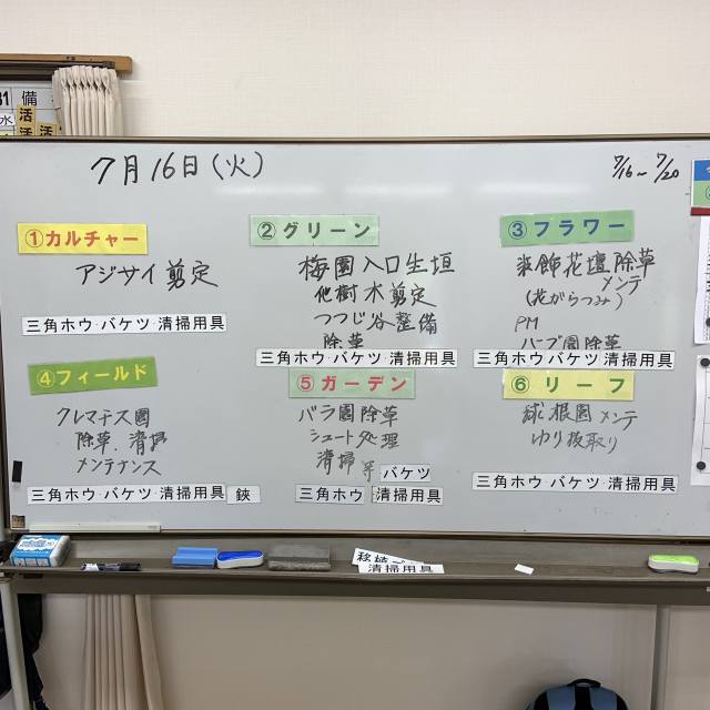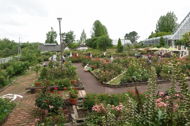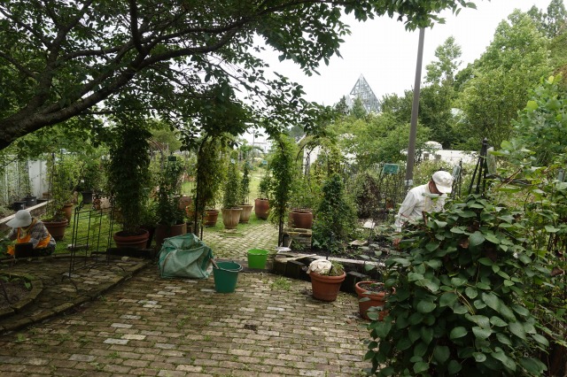 本日の活動はこんなです。まずは、バラ園のガーデングループとその向こうのクレマチス園でのフィ―ルドグループの活動風景です。