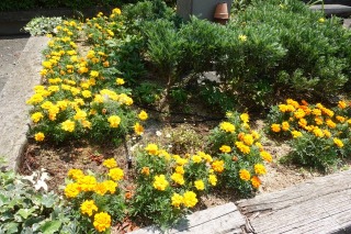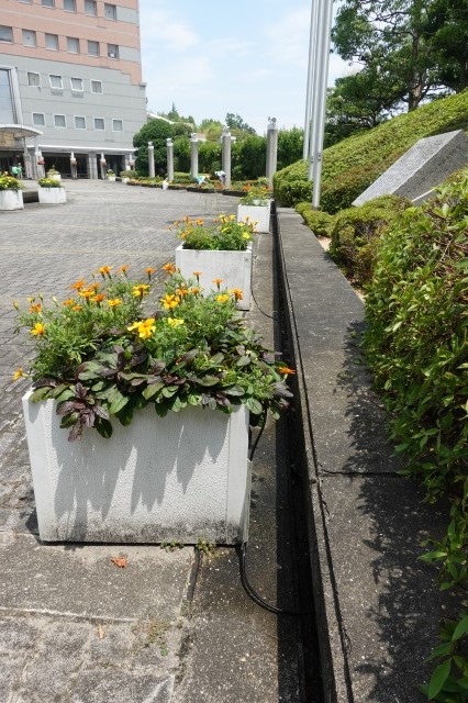向かって左側の枕木花壇・プランター内はほぼ完成、盛夏に間に合いそうです・・