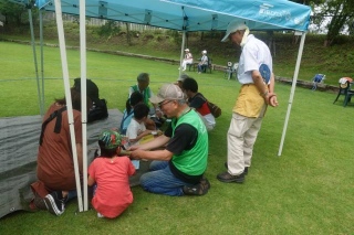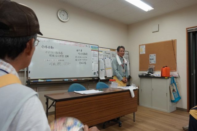 土曜日の朝会風景。右のオレンジ色バッグが熱中症対策キットです。
