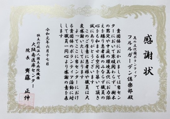 下は頂いた、表彰状と大阪南医療センターのボランティアの皆さま。