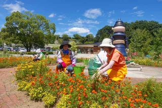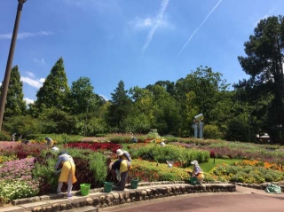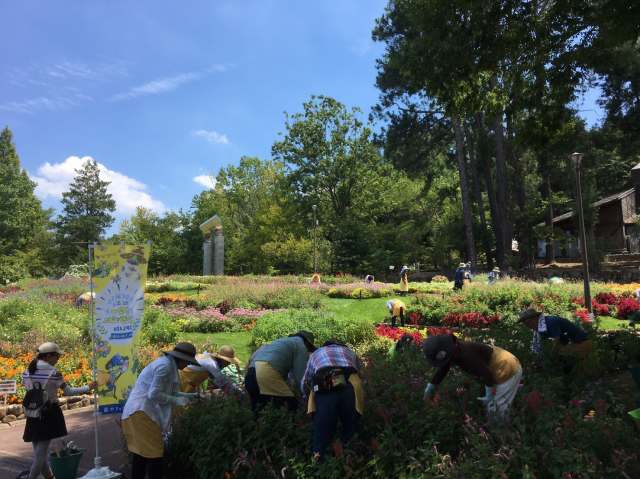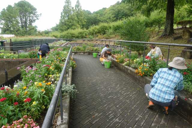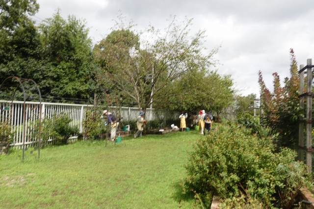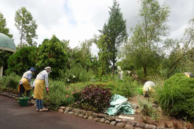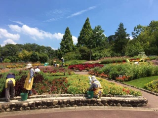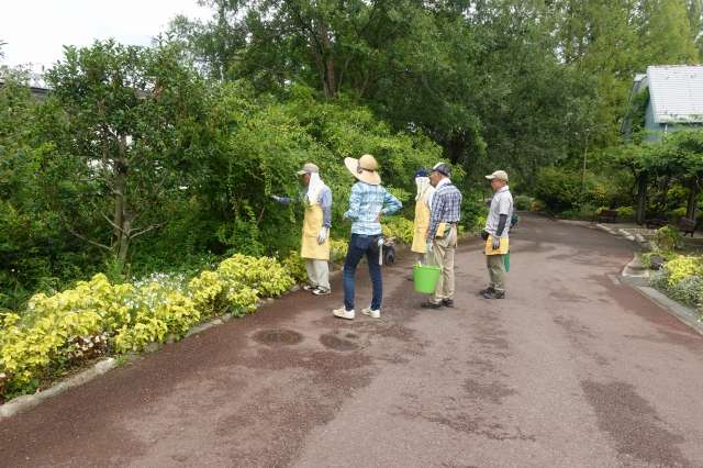 猛暑の中、フラワーグループは出入り口の花壇の除草の後、装飾花壇の花柄摘みや切り込み作業。