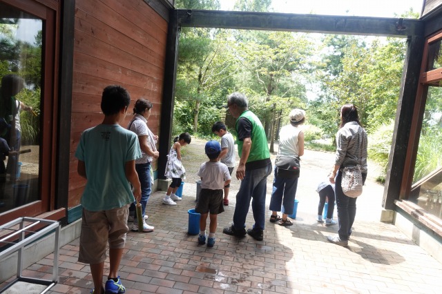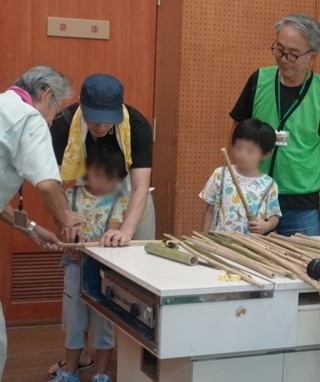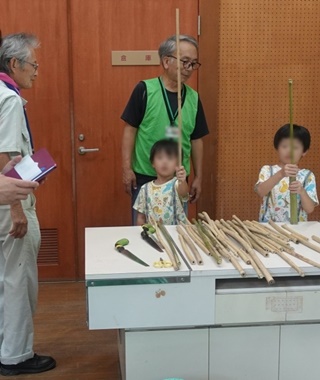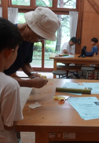 今週で夏休みの「竹の水てっぽうづくり」は終わりです。雨だったので、花の工房の室内で。大勢作りに来てくださってありがとう!という気持ち(^^♪